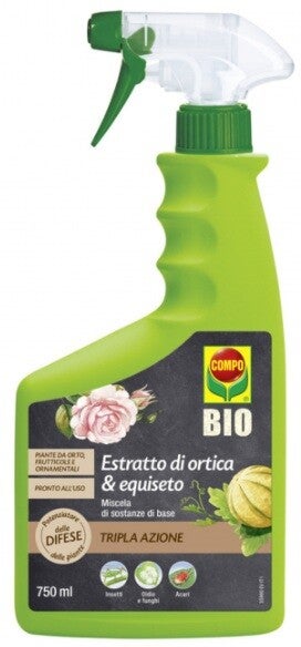 Estratto di equiseto e ortica Compo Bio Tripla Azione per una protezione completa ed efficace delle tue piante. Si tratta di una miscela naturale al 100% e composta da due estratti vegetali: estratto di ortica e estratto di equiseto. L'estratto di ortica è una sostanza di base con azione insetticida contro acari, afidi, lepidotteri e altri parassiti delle piante. L'estratto di equiseto ha un'azione fungicida contro oidio, peronospora, ticchiolatura e botrite. L'unione di queste due sostanze rende Tripla Azione Bio un prodotto particolarmente efficace per la protezione delle piante nel rispetto dell'ambiente. Tripla Azione Bio è anche un potenziatore delle difese naturali delle piante contro l'attacco di insetti e parassiti ed è pronto all'uso: non serve nessuna miscelazione o dosaggio particolare. Puoi utilizzarlo per tutte le tipologie di piante orticole, ornamentali e alberi da frutto sia in vaso che in piena terra.